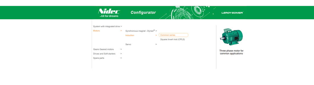 Der Leroy-Somer Konfigurator ermöglicht die Auswahl von elektromechanischen Antriebssystemen: Motoren und Getriebemotoren ohne Bremse oder elektronische Frequenzumrichter. Für die ausgewählten Produkte können CAD-Dateien in 2D und 3D sowie technische Daten ausgedruckt werden.