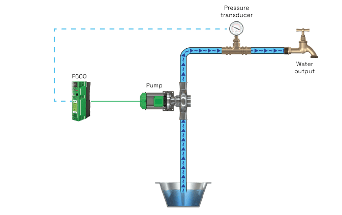 Where there is no-flow or low-flow, the F600 drive can automatically enter sleep mode to save energy, based on the feedback of a pulsed flow transducer, or triggered by a flow switch, or detected by the software alone.