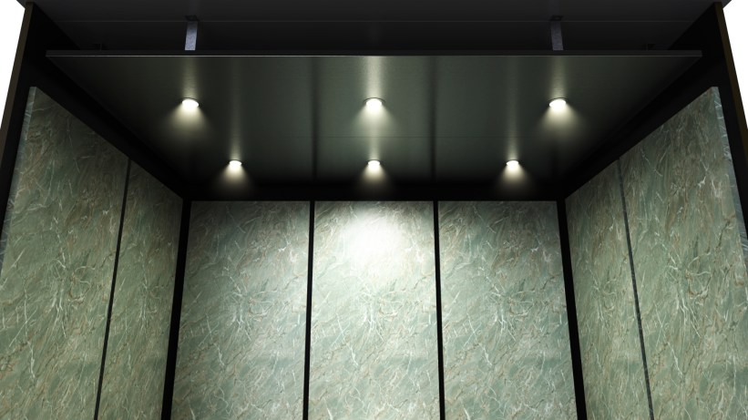 Wood core or steel shell walls / Plastic laminate raised upper and lower panels (shown with Wilson Art 4956-22 Golden Lightning), mid panels stainless steel #4 / Stainless steel #4 base / Black frieze and reveals.