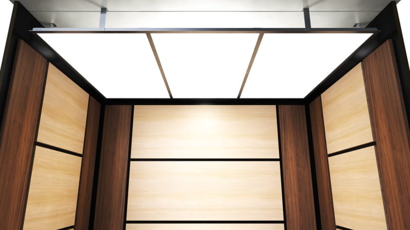 Wood core or steel shell walls / Plastic laminate raised panels (corner portions shown with Wilson Art 7943-07 Colombian Walnut, middle portions shown with Wilson Art 7971-12 Uptown Walnut) / Stainless steel #4 base / Black frieze and reveals.