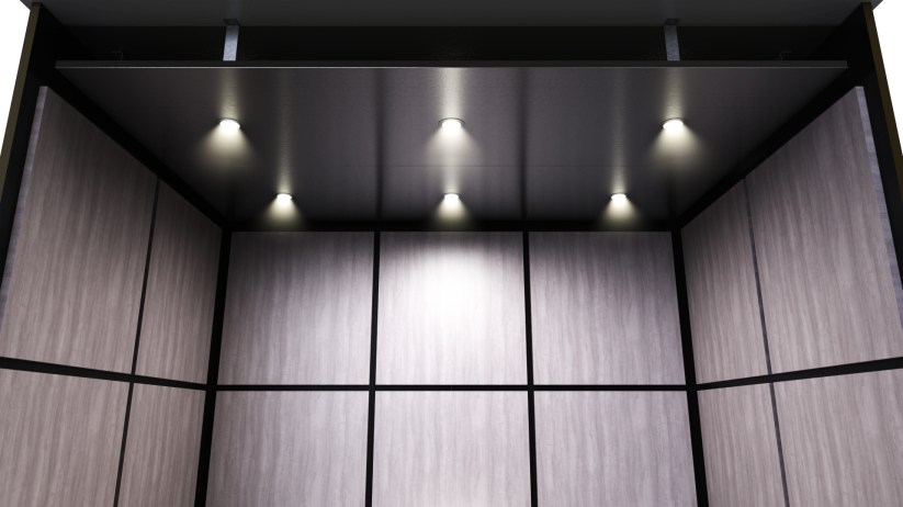 Wood core or steel shell walls / Raised panels – upper panels plastic laminate (shown with Wilson Art 7995 Sterling Ash), lower panels stainless steel #4 / Stainless steel #4 base / Black frieze and reveals.