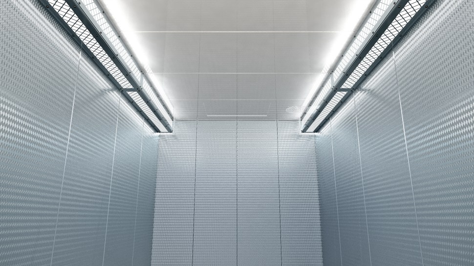 Rigidized stainless steel shell walls / 3/8″ x 6″ Stainless steel #4 handrails, 3/8″ x 6″ stainless steel #4 bumper rails / White powder coated car top / stainless steel #4 light coves with vandal guards and white polycarbonate diffuser panels / Strip light fixtures with T8 fluorescent lamps.