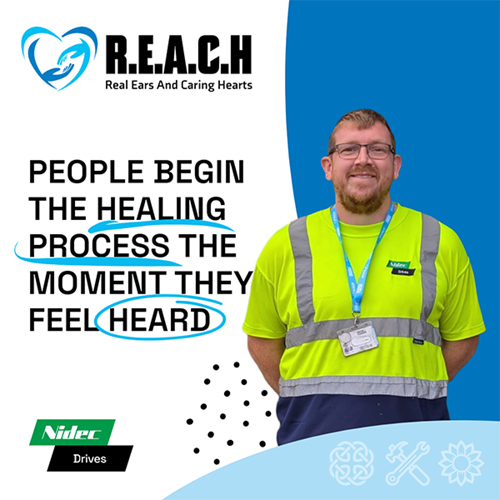 Originally formed by a group of male colleagues at Nidec Drives UK, R.E.A.C.H. was born from a desire to break down barriers and encourage men to seek help when facing mental health challenges. With only 36% of NHS mental health service users identifying as male, the team saw an opportunity to change the narrative and create a space where listening, caring, and signposting support could make a meaningful impact.
