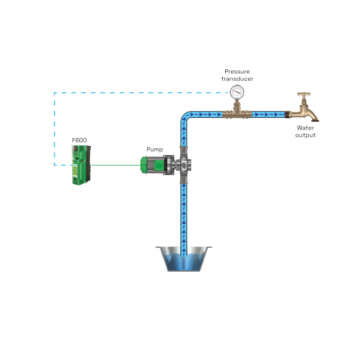 Where there is no-flow or low-flow, the F600 drive can automatically enter sleep mode to save energy, based on the feedback of a pulsed flow transducer, or triggered by a flow switch, or detected by the software alone.