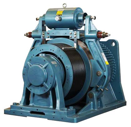 Imperial Electric Frame 700 machines feature an extended chassis and a heavy-duty outboard bearing support to easily accommodate the special load characteristics required for double-wrap roping configurations. With a maximum sheave shaft load of up to 55,000 lbs., power ratings to 115HP, and dual-coil, independent brakes applying 6,000 N-m torque per side, these machines offer up to 5,000 lbs. capacity roped 1:1 or 9,000 lbs. capacity roped 2:1 with maximum speeds of 1,400 and 700 fpm, respectively. The 700 series is fantastic for use with high rise or heavy loads, overhead basement and side pull applications, and for modernization and new construction alike.